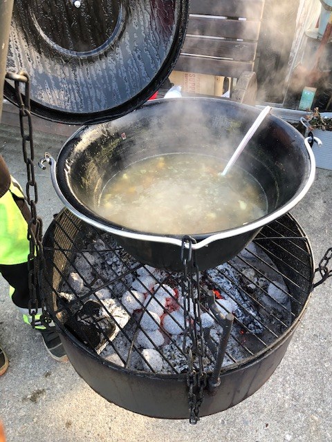 Suppegjengen sørget for kjempedeilig dugnadssuppe, der produkter fra parsellen inngikk i en velsmakende enhet. Restene av suppa ble donert til frelsesarmeens natthjem, og det satte de pris på.